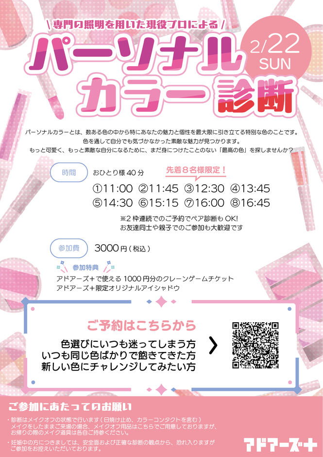 株式会社ワイドレジャー(本社:福岡県小郡市)は、女性を中心に“自分らしさ”を楽しむ体験イベントとして、「パーソナルカラー診断イベント」を2026年2月22日(日)にアドアーズプラス筑紫野店(イオンモール筑紫野3階)にて開催いたします。