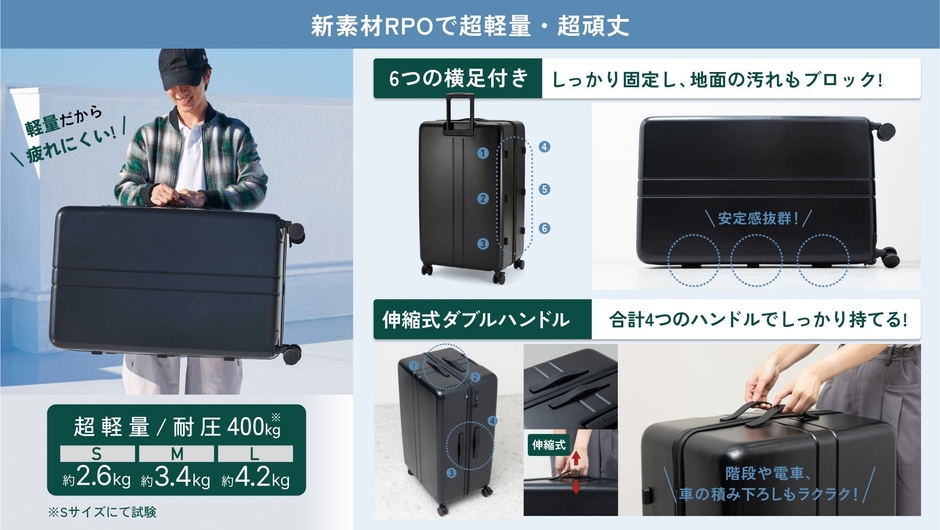 軽量で高強度を誇る新素材RPOを採用し、柔軟性と復元力に優れたボディを実現。衝撃に強く、長距離移動も安心です。業界トップクラスの軽さ約5.6kgで、約151Lの大容量を両立。留学や家族旅行、出張、スポーツ遠征など、荷物の多いシーンに対応します。かさばる衣類や大型道具も余裕で収納可能です。また、底面6点横足により安定性と汚れ防止を確保。トップとサイドのダブルハンドルで持ち運びやすさにも配慮しています。