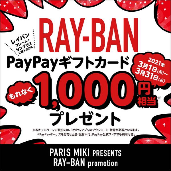 「パリミキ・メガネの三城×レイバン」PayPayギフトカード ¥1,000相当プレゼント キャンペーンのお知らせ