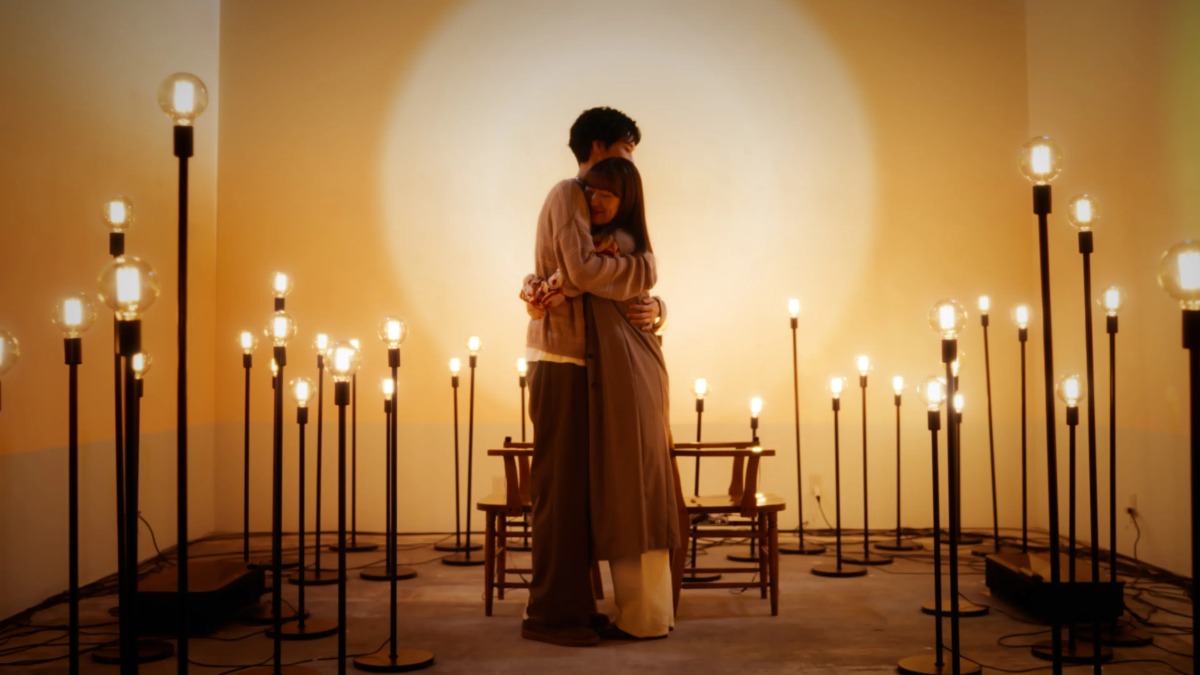 クライマックスでは、男性の真のパートナーである女性が背後の椅子に座り二人が手を繋ぐと、鼓動と光がゆっくりシンクロし始めます。お互いの顔を見合わせて驚き、ふたりはハグを交わします。「やわらかさは、心まで近づける。」というメッセージで映像は締めくくられます。