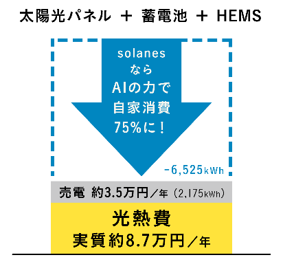 「solanes(ソラネス)」は、住宅におけるエネルギーの自給自足を目指すサービスです。太陽光で発電し、蓄電池にため、家庭で使うというシステムはこれまでもありましたが、ここにAIによる自動制御システムを加えたのがソラネスです。AIが発電量や翌日の天気予報、その家庭における電気の使用状況などを学習。無駄のない自家消費を自動でコントロールします。面倒なエアコンのオンオフの操作も不要です。