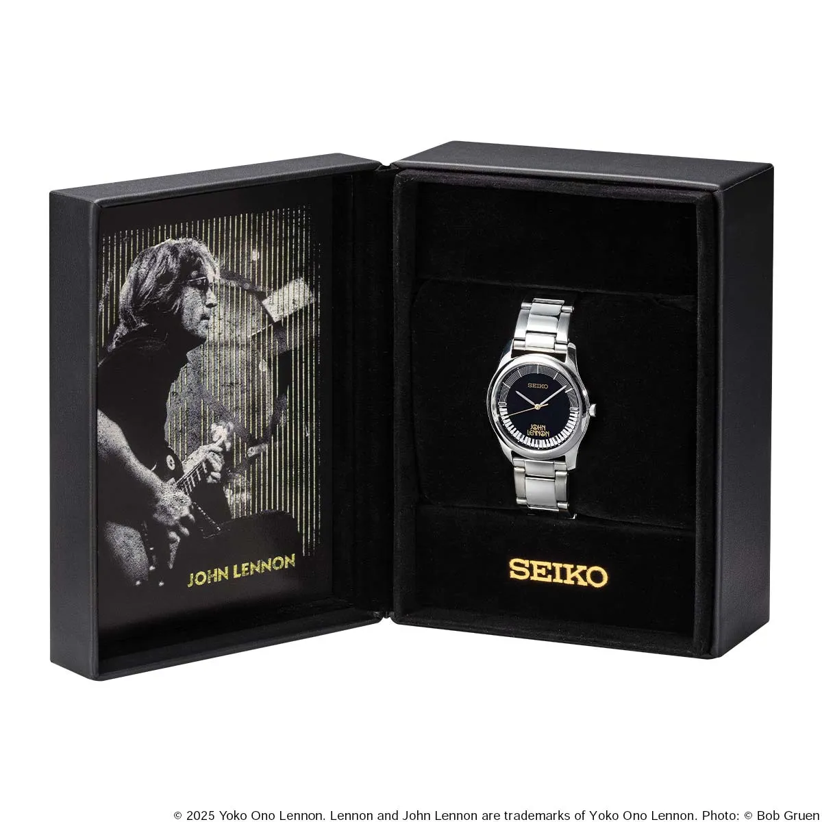 腕時計は、ジョン・レノンのロゴが箔押しされた特製ボックスに収納。ボックスの内側には、ギターを演奏するジョン・レノンのフォトがセットされています。