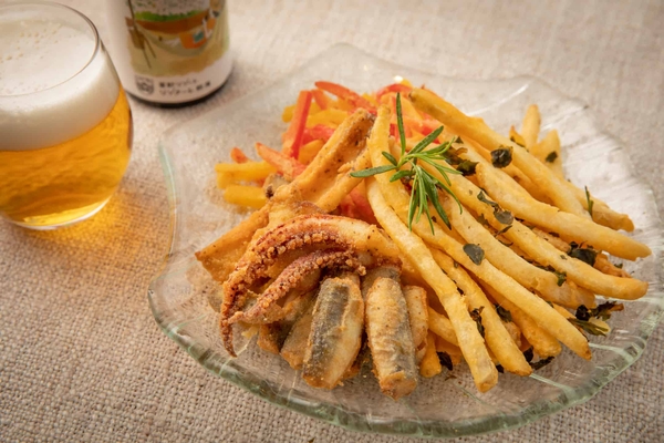 海沿いにあるカフェ「Sanremo Solare」協力のもと、海上カラ桶限定フードメニューが登場します。のりをふんだんに使用し、磯の香りを感じる「のりしおポテト」や、ジューシーな味わいの「海鮮と彩り野菜のフリット」をワンプレートで楽しめます。また、海上カラ桶のおともとして、熱海市近郊にある醸造所「宇佐美麦酒酒造」のクラフトビール「海のゴールデンエール」を1人1本プレゼント。伊豆の海にインスパイアされたビールを、海の上で味わうことができます。