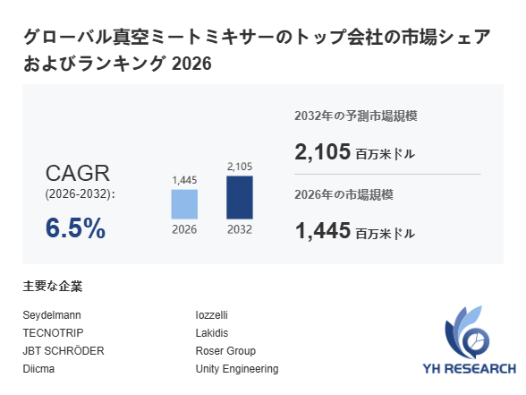 YHResearch調査チームの最新レポート「グローバル真空ミートミキサーのトップ会社の市場シェアおよびランキング 2026」によると、2026年の1445百万米ドルから2032年には2105百万米ドルに成長し、2026年から2032年の間にCAGRは6.5%になると予測されています。