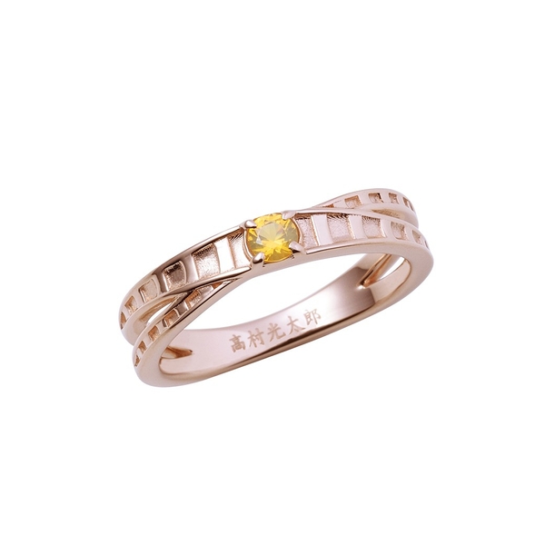 ピンクゴールドコーティングを施した表面にはイメージカラーストーン、内側には名前を刻印しました。