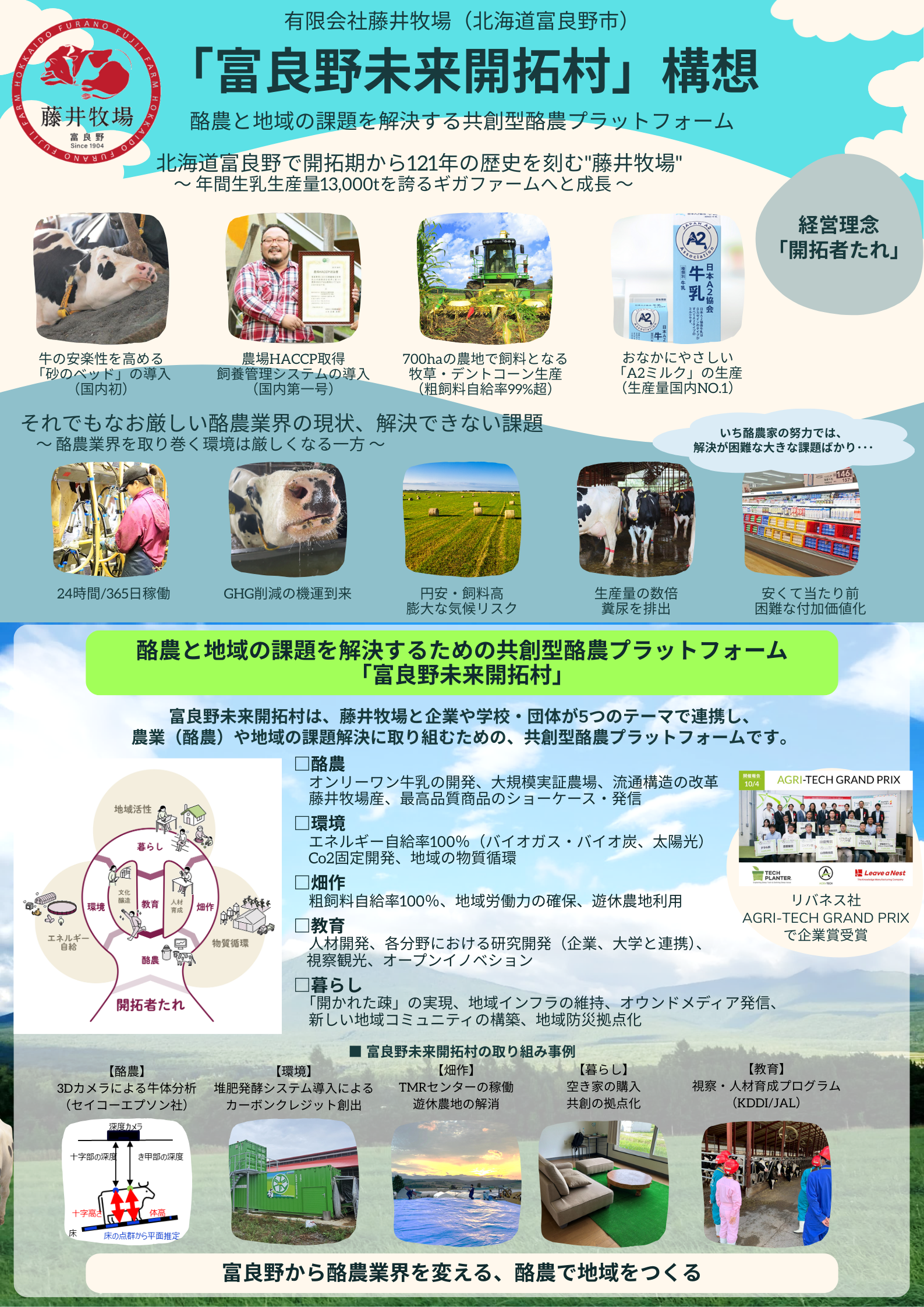 藤井牧場は、1904年の創業以降120年以上北海道富良野市において酪農業を追求してまいりました。「開拓者たれ」の経営理念のもと挑戦を続け、現在では年間生乳生産量13,000tを超えるギガファームへと成長を遂げました。しかしながら酪農そして地域を取り巻く状況は依然厳しく、業界構造の硬直化、酪農家の育成や人材の確保、GHG排出や家畜糞尿等の環境問題、廃校や空き家、耕作放棄地の地域課題など単独の企業では根本的な解決が難しい状態です。