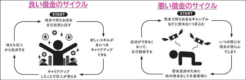 日本人は、借金に対し、「借金=悪」「借金をする人は、お金にだらしない」「借金は、してはいけないもの」と、ネガティブなイメージを抱いています。でも、「借金=悪」だと私は考えていません。むしろ、「借金ウェルカム」です。たしかに、遊ぶ金ほしさの享楽的な借金は悪ですが、自分を高める借金は善だからです。