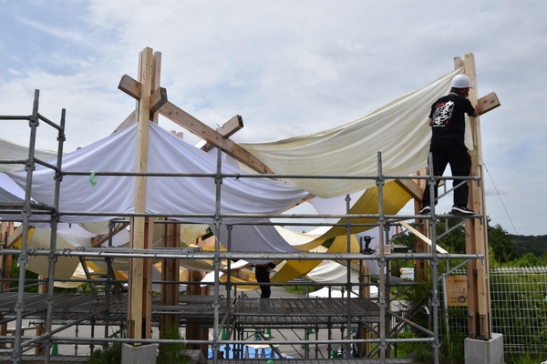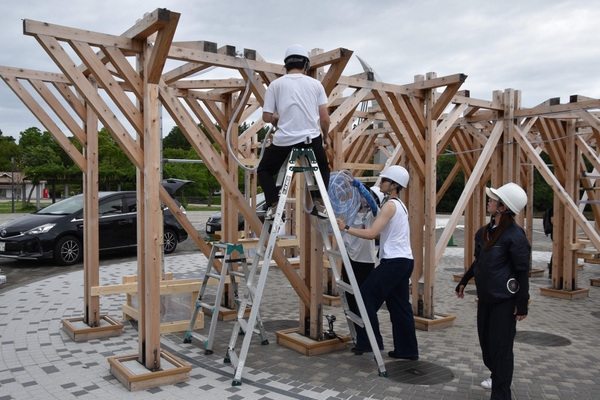 2005年の「愛・地球博」(愛知万博)開催から20周年を記念した愛知県主催の事業「愛・地球博20祭」の一環として企画され、会場となった愛知県長久手市の「愛・地球博記念公園」を特別感あふれる空間に演出するイベント「彩(いろどり)の回廊」に、本学理工学部建築学科の生田京子教授と谷田真准教授、佐藤布武准教授の研究室が参加し、構想から設計、制作まで約1年間をかけて制作した作品が6月28日(土)から7月20日(日)まで展示されます。6月26日には学生たちが最後の仕上げ作業に追われました。