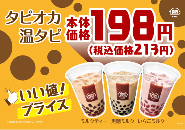 ミニストップ株式会社(本社:千葉県千葉市 代表取締役社長:藤本 明裕、以下:ミニストップ)は、コロナ禍において外出自粛等様々な制限により経済的に厳しい状況が続く中、2021年2月5日(金)より、人気商品「タピオカドリンク」(本体価格:350円)全6品の通常価格を198円(本体価格)※で販売いたします。