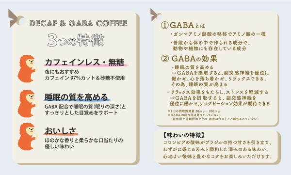 コーヒーの味や香りを好んでいても、体質や体調などによってカフェイン摂取を制限する必要があり、カフェインレスコーヒーを選択するものの、味に不満がある(味、香りが薄い、コクが感じられないなど)方が多い。また、おやすみ前にコーヒーでリラックスしたいけれどカフェインは摂取せずに、リラックスして深い眠りについてスッキリ目覚めたい。それらの声に応える商品として「GABA配合のコーヒー(機能性表示食品)」を開発いたしました。