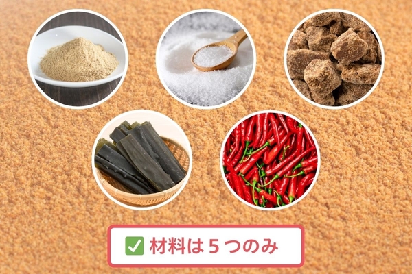 原材料は、「発酵ぬか、食塩、加工黒糖、昆布、唐辛子」のみで添加物不使用。