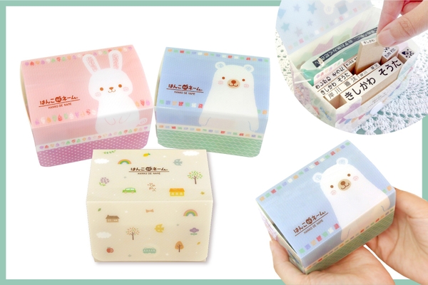 お名前スタンプを立てて収納できるオリジナルケースの絵柄はシロクマ・ウサギ・なちゅらるBOXのいずれかからお好みでチョイスできます。