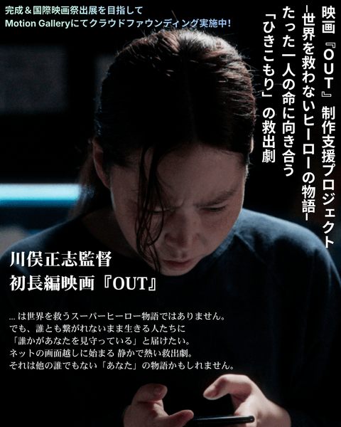 日本国内で140万人以上いるとも言われるひきこもり問題。この社会課題に真正面から取り組む長編映画『OUT』(脚本・監督・プロデューサー:川俣正志/共同脚本・プロデューサー:ニコラス・R・ザバリー)が完成目前となり、仕上げ費用の最終調達のため11月17日よりMotion Galleryでクラウドファンディングを開始しました。