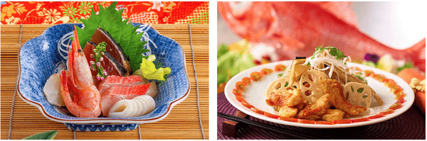 右:金目鯛を使った中華の一品「金目鯛の唐揚げ 中華風香味だれ」。ふわふわの身とからりと揚がった衣に甘辛のたれが絡む、お箸の止まらなくなる美味しさをご賞味ください。