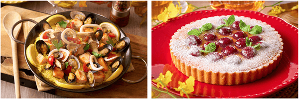 左:栃木県産きのこと魚介のパエリア。具材から出る旨味が染みたサフランライスとたっぷり具材をお楽しみください。