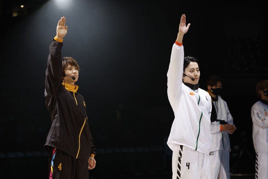 ハーフタイムショーでは、高野率いる俳優たちによる光るボールを取り入れた幻想的でキレキレなパフォーマンスと、丘山とサプライズで登場した鳥越裕貴らは自身のユニット「WINWIN」の曲を披露してのパフォーマンスで会場を沸かせ、後半戦に突入。3rdクォーターが終わったところで36対26とDREAM CATERPILLARSがリードを広げたところで、救済企画とも言える“各チームのヘッドコーチによるフリースロー5番勝負”が行われた。通常のフリースローサークルからのシュートは1点、3ポイントラインからのフリースローは3点、さらに10点が加算されるコート中央のセンターサークルからのロングシュートの中から選んで5本シュートするというルール。DREAM CATERPILLARSの岸 祐二が3ポイントシュートを決めたものの、SPARK SEEDSの荒木健太朗がロングシュートを決めて10点をゲット。「39対36」の3点差で4thクォーターが始まった。残り3分26秒で「48対48」の同点となり、その後も両チームが点を加え、最終結果は55対56でSPARK SEEDSが見事な逆転勝利を収めた。