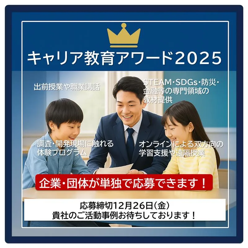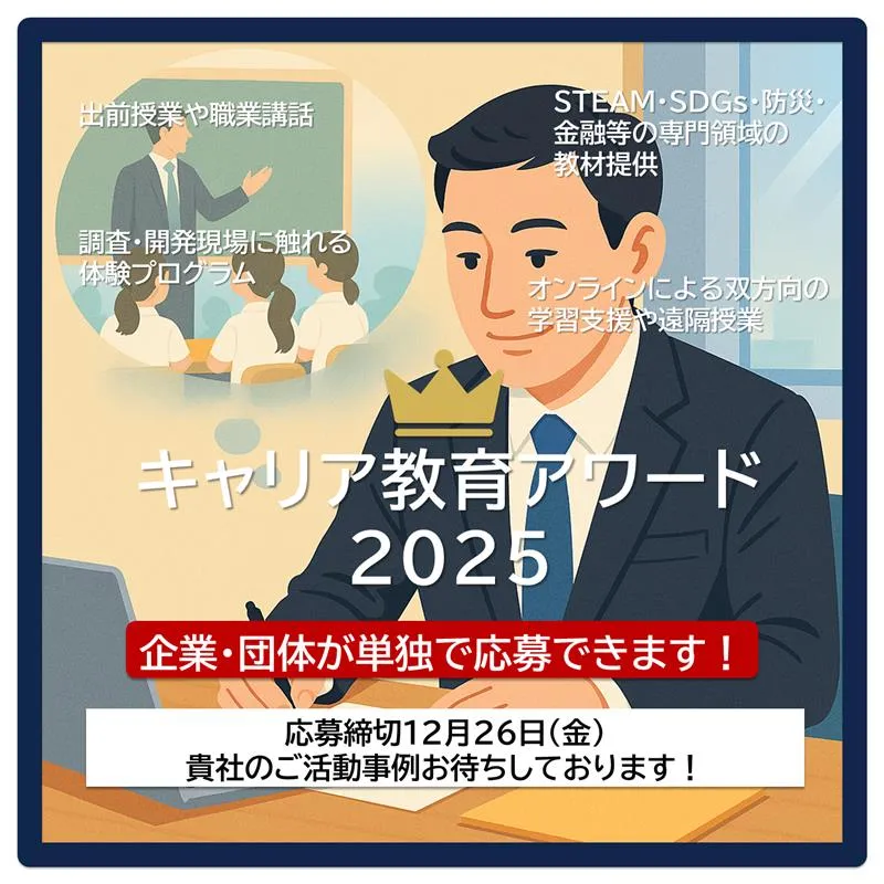 一般社団法人キャリア教育コーディネーターネットワーク協議会(東京都杉並区)は、企業・団体による教育支援の優れた実践を表彰する「キャリア教育アワード2025」の応募締め切り(12月26日)が近づいていることを発表しました。