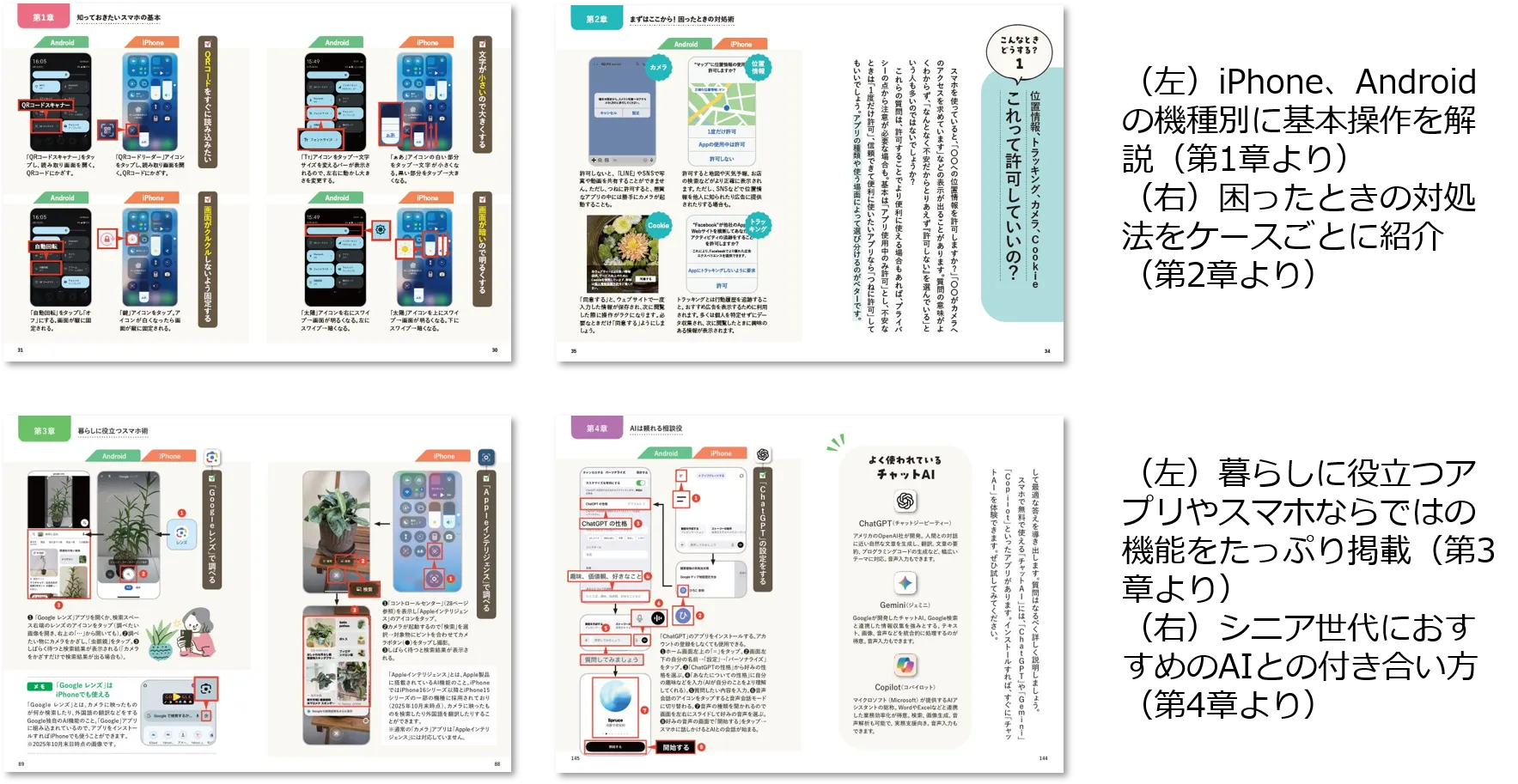 「わからないことを人に聞くのが億劫」「自分のペースで覚えたい」という多くのシニア層が持つニーズに応え、画面の文字を大きくする、QRコードを読み込むといったスマホの基本的な「困った」を即座に解決する対処術から、人生後半の暮らしをもっと楽しむため、LINEやカレンダー、Googleマップなどのアプリの便利な使い方も多数掲載。さらには、シニア層の日々の暮らしをハッピーにしてくれる相棒として、気後れせずに活用したいAIについても解説。その代表格であるChatGPTやCopilotで、旅の計画の立ててもらったり、メール文面などのメッセージを考えてもらったり、日常生活に役立つ具体的なシーンを紹介しています。