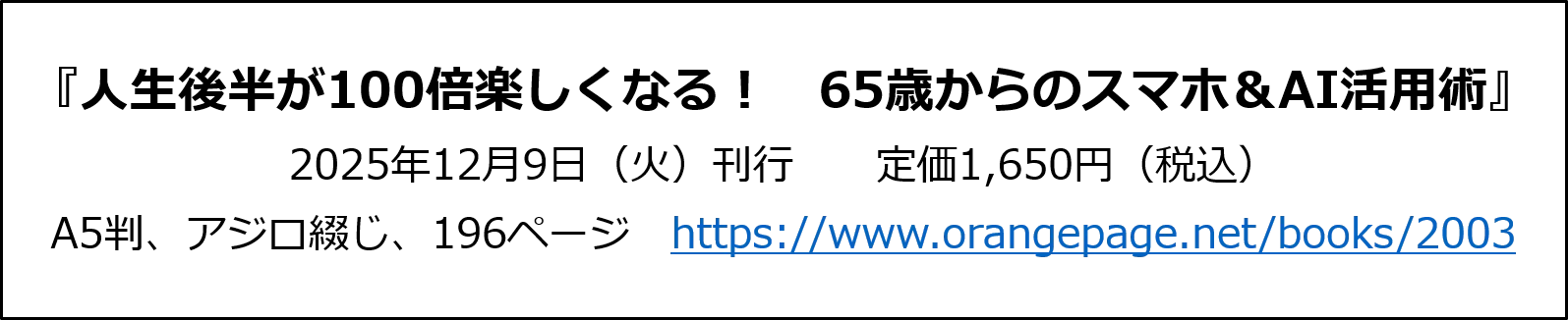 株式会社オレンジページ(東京都港区)は、初心者・シニア向けにスマホやパソコンの使い方を解説する、登録者数38万人超のYouTubeチャンネル「いなわくTV」でおなじみの川島玲子監修による『65歳からのスマホ&AI活用術』を12月9日(火)に発売します。行政手続きやキャッシュレス決済など社会のデジタル化は急速に進む一方、「スマートフォンは難しい」「AIなんて自分には縁遠い」と感じるシニア層は少なくありません。本書は、こうした65歳以上の方のスマートフォンへの苦手意識を払拭し、人生後半をもっと自由に、自分らしく過ごすための「スマホ&AI」の活用術をわかりやすく解説しています。