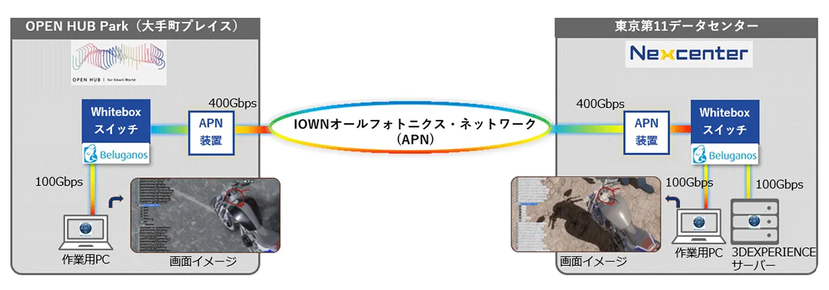 本実証では、武蔵野市にある東京第11データセンターと大手町プレイスにあるOPEN HUB Park※7をIOWN(R) APNで接続し、ダッソー・システムズの3DEXPERIENCEプラットフォームを用いて遠隔共同編集を行いました。武蔵野市側には、3DCADの同一モデルをリアルタイムに共有・編集できる3DEXPERIENCEプラットフォームのデスクトップアプリケーションと3DCADデータを格納する3DEXPERIENCEプラットフォームのサーバー、大手町プレイス側に作業者のPCとして3DEXPERIENCEプラットフォームのデスクトップアプリケーションを設置しました。この2拠点間で、数千から数万個におよぶ大容量、高精細かつ複数種類の3DCADデータやPLMデータをサーバーからダウンロードし、3DCADを用いた共同編集の検証を行いました。