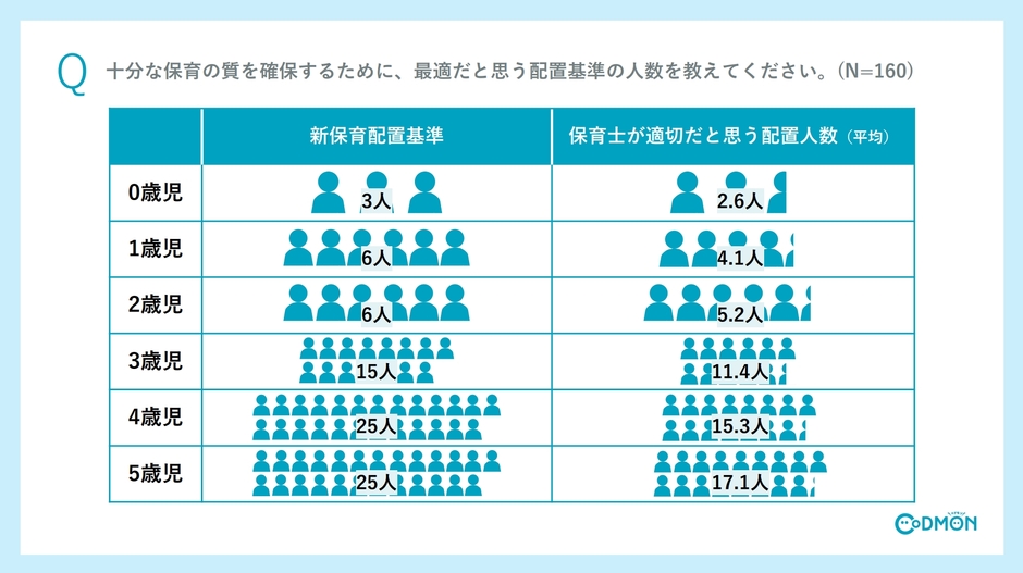 最適だと思う配置基準の人数について聞いたところ、その平均値はすべての年齢で現在の国の配置基準を下回る結果となりました。特に昨年4月に30人から25人へと改正された4歳児に関しては、最適だと思う人数の平均値は15.3人とおよそ10人も下回りました。