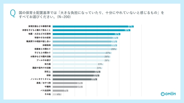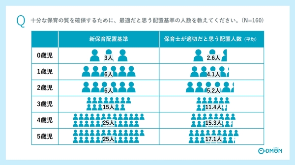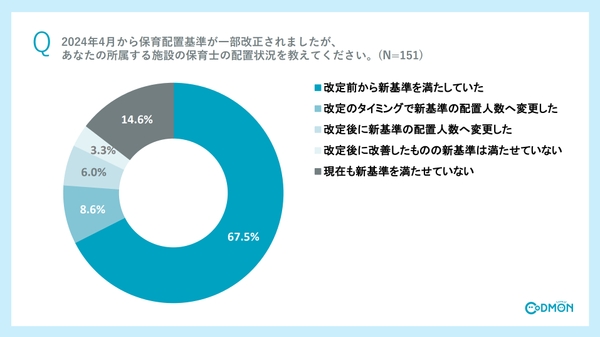 株式会社コドモン(本社:東京都品川区、代表取締役:小池義則、以下 コドモン)は、保育士配置基準の実態調査を実施しました。調査の結果、8割以上が新たな配置基準に対応していることが明らかになりました。また、配置基準変更における課題としては「保育士の人手不足」が最多。その他、新たな配置基準への評価としては、半数以上が不十分と感じていることがわかりました。