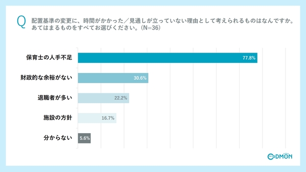 新たな配置基準への対応が遅れた、もしくは現在も満たしていないと回答した方にその理由を聞いたところ、「保育士の人手不足」が77.8%で最多でした。次いで「財政的な余裕がない」が30.6%、「退職者が多い」が22.2%という結果となりました。