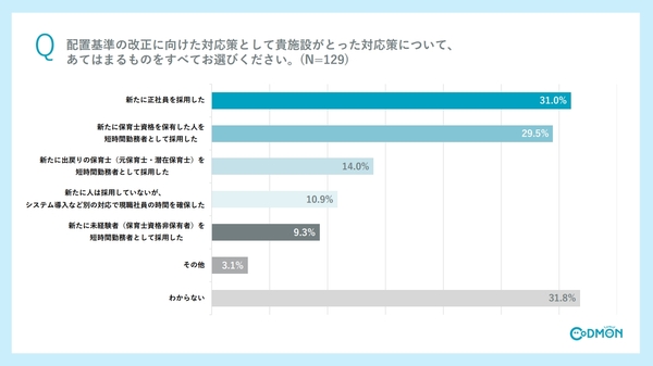 配置基準改善に向けた対応としては、「新たに正社員を雇用した」が31%、「新たに保育士資格を保有した人を短時間勤務者として採用した」が29.5%と、それぞれ3割程度でした。中には、保育士資格非保有者を採用したと回答した方もいました。