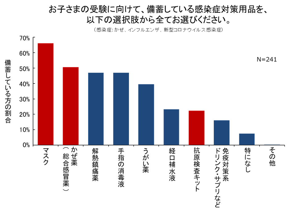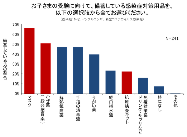また、今回の調査では受験に向けた感染症対策として「マスク」や「かぜ薬(総合感冒薬)」を常備しているご家庭が半数を超えました。さらに、抗原検査キットも、約2割のご家庭で常備していることが分かりました。一般用の抗原検査キットは、2022年から薬局やインターネット等で購入できるようになったこともあり、ご家庭によっては感染症対策の選択肢の1つとして取り入れられているようです。