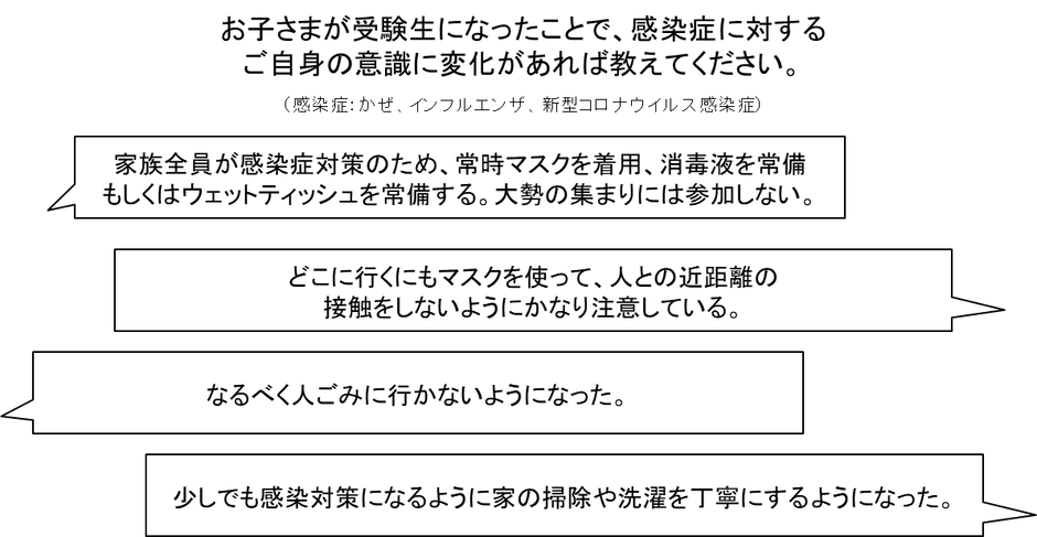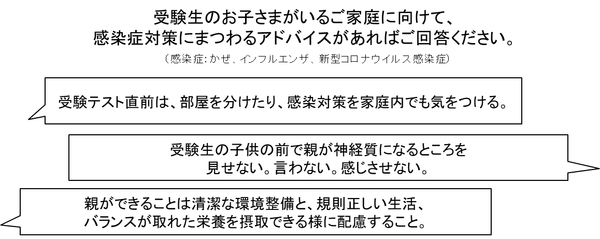 今回の調査では、同じく受験生を持つ保護者の方々から、感染症対策に関するアドバイスが寄せられました。家庭内で人との接触を減らす物理的な対策から心理的な気遣いに至るまで様々な工夫をされていることがわかりました。