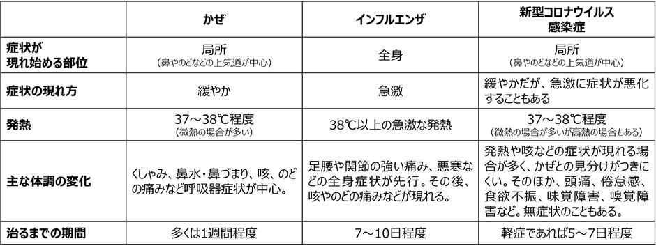 <かぜ・インフルエンザ・新型コロナウイルス感染症の違い>
