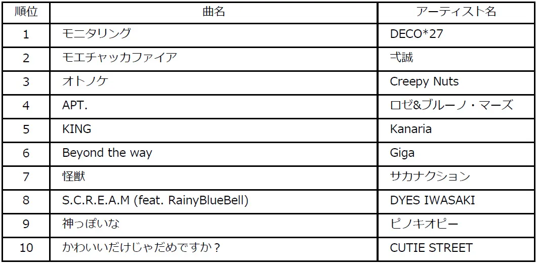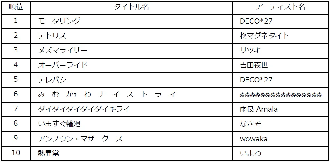 1位楽曲:「モニタリング」アーティスト:DECO*27
