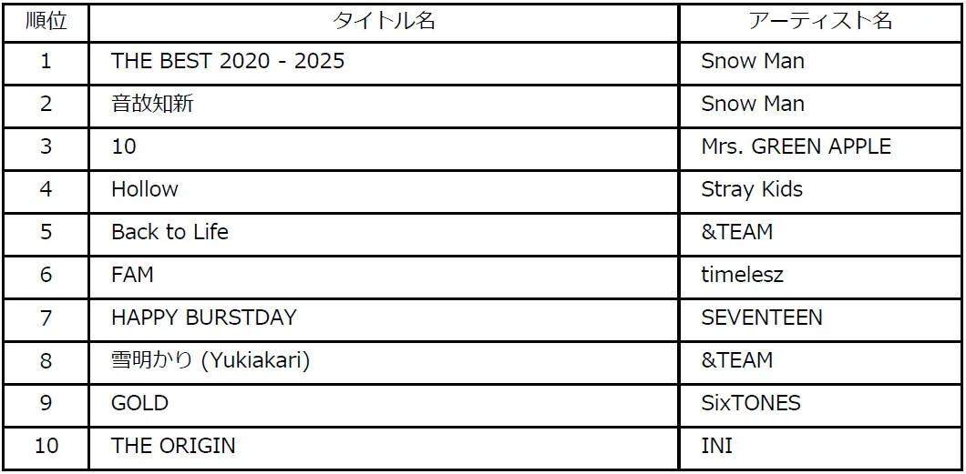 1位タイトル:『THE BEST 2020 - 2025』アーティスト:Snow Man