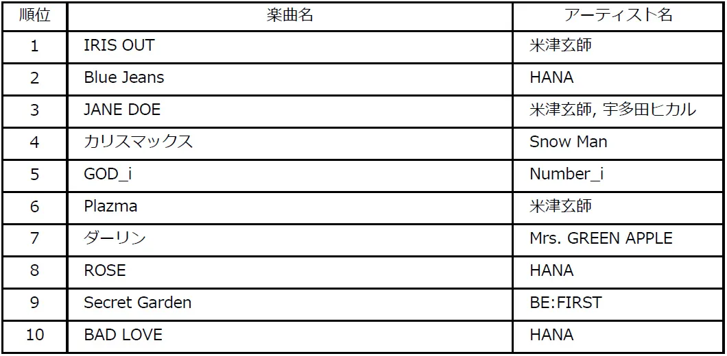 1位楽曲:「IRIS OUT」アーティスト:米津玄師