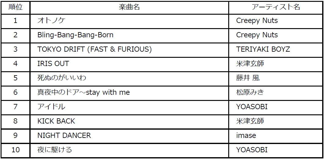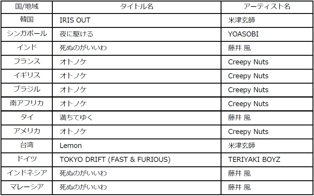 日本人アーティストによる海外公演の活発化、国際音楽賞【MUSIC AWARDS JAPAN】の開催など、音楽のグローバル化の機運が高まる昨今。世界でヒットしている日本の楽曲チャート“Global Japan Songs Excl. Japan”では、Creepy Nuts「オトノケ」が首位を獲得しました。加えて、Japan Songs(国/地域別チャート)では、5つの国と地域で首位に輝きました。
