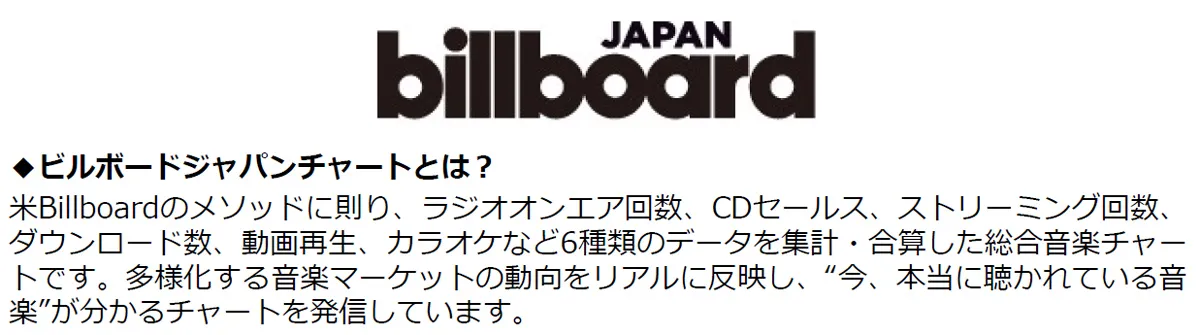全国推定売上枚数、ダウンロード回数、ラジオ放送回数、ストリーミング数、YouTubeの動画再生回数、カラオケ歌唱回数を元にした独自ポイントを合算した、米国でもBillboard音楽チャートの中心となるチャート