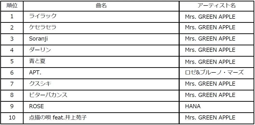 1位楽曲:「ライラック」アーティスト:Mrs. GREEN APPLE