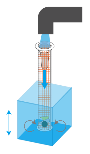 2.絞り管によって汚染が垂直に落下し、水に溶ける異物は粉砕されていきます。