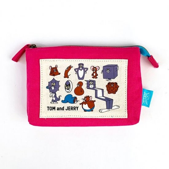 ピンクとパープルカラーが目立って可愛い3ポケットポーチ♪傘に変身したトムやワッフルになっちゃったジェリーなど、いろんな変身シリーズが描かれたポーチ。