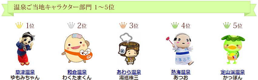 中間結果では温泉地部門同様に、草津温泉のご当地キャラクター“ゆもみちゃん”が1位となっており、2位は北陸新幹線の金沢開業で注目を浴びる、石川県の和倉温泉ご当地キャラクター“わくたまくん”が僅差で追っています。本順位も前回のランキングから大きく変動しているため、どのご当地キャラクターが上位に選出されるのか、今後の動向に注目です。