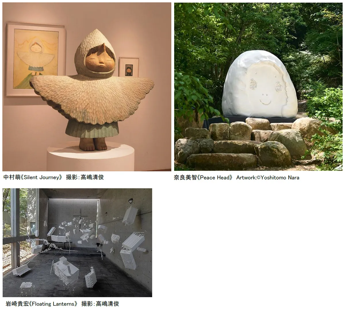| 神戸六甲ミーツ・アート2025 beyond 「オーディエンス大賞」受賞アーティスト ※敬称略・50音順 第1位 中村萌《Silent Journey》 展示場所:六甲高山植物園 第1位 奈良美智《Peace Head》 展示場所:ROKKO森の音ミュージアム 第3位 岩崎貴宏《Floating Lanterns》 展示場所:風の教会エリア |