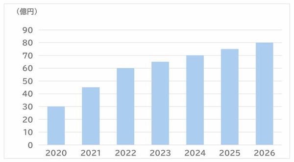 日本国内の陸上養殖設備市場(閉鎖循環式)は、2023年時点で約65億円と推定され、当面、年間5~10%増の好調な推移が続き、2026年には市場規模が80億円に拡大すると予測した。大規模な施設の建設は限られるが、新規事業としての引き合いが増えており、市場の好調な拡大が続くと見込まれる。