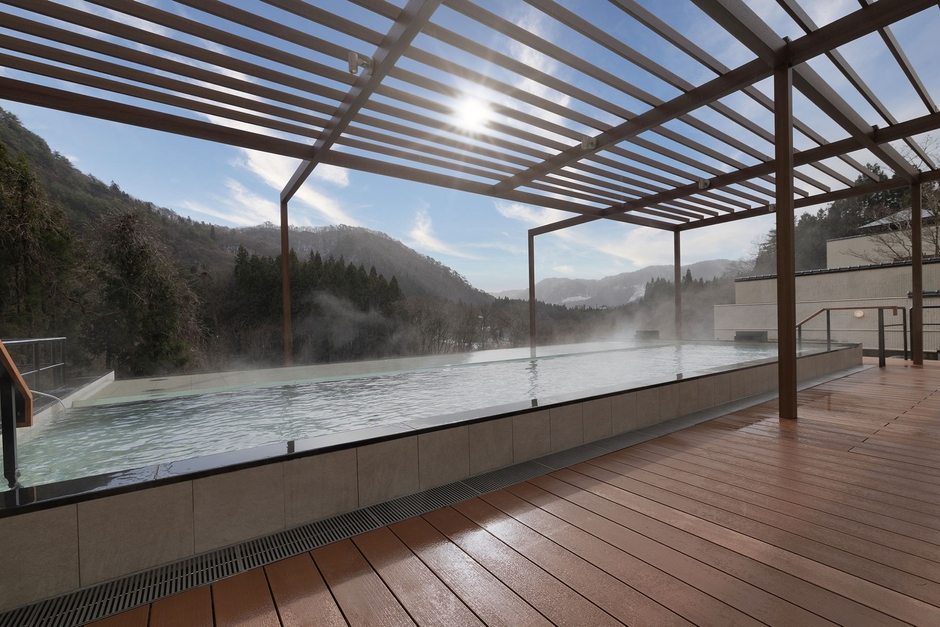 至福の温泉体験をご満喫いただくため、既存の露天風呂を拡張し「インフィニティ温泉」としてリノベーションいたしました。湯に浸かると視界に広がるのは壮大な渓谷の風景。崖からせり出すように造られた湯船は、まるで渓谷の上に浮かんでいるかのような浮遊感を味わえます。