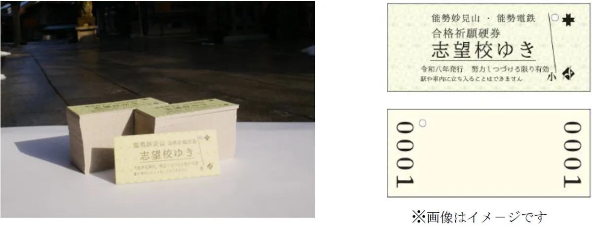能勢電鉄と能勢妙見山が共同で硬券タイプのお守りを「合格祈願硬券・志望校ゆき」として製作し、北極星信仰の聖地・能勢妙見山「開運殿」にて開運合格祈祷をして配付します。