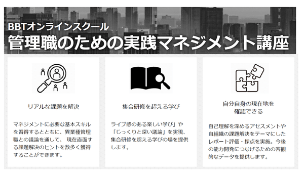 あらゆる年齢層に対し生涯に渡るリカレント教育を提供する株式会社ビジネス・ブレークスルー(所在地:東京都千代田区、代表取締役:柴田巌、以下BBT)は、6月1日に新規開講する「BBTオンラインスクール(公開参加型研修) 管理職の為の実践マネジメント講座」の受講生の募集を開始したことをお知らせいたします。既に管理職として活躍している方が、「ピープルマネジメント」と「事業マネジメント」両スキルのステップアップを目指して受講できる内容で、受講期間は3か月、価格は88,000円での提供となります。また、1社1名から受講が可能なため、異業種管理職とのネットワークも構築することができます。