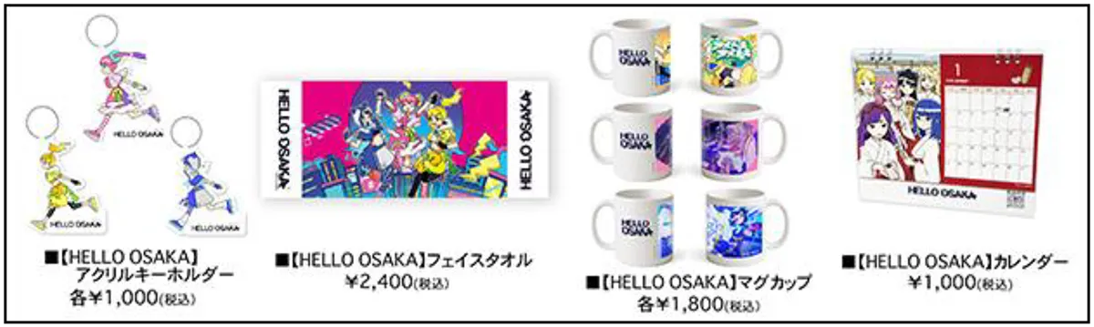 これまでにもさまざまな企業とのコラボレーショングッズやキャンペーンを展開してきた『HELLO OSAKA』。満を持して、作中に登場する人気キャラクター【アラ・ウメ・ミカ】をモチーフにしたオフィシャルグッズを発売します。ラインナップは、アクリルキーホルダー、フェイスタオル、マグカップ、カレンダーの4種です。今後も魅力的な企画を予定しておりますので、ぜひご注目下さい。