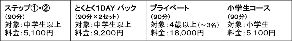 ※プライベートレッスンは4名を超える場合は、追加1名毎に90分につき+6,000円