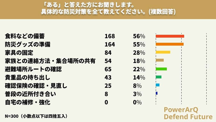 自宅で防災対策に取り組んでいることが「ある」と答えた方に具体的な防災対策をお聞きしました。(複数回答)食料などの備蓄56%、防災グッズの準備55%、家具の固定28%、家族との連絡方法・集合場所の共有18%、避難場所ルートの確認22%、貴重品の持ち出し確認14%、保険の確認・見直し8%、普段の近所付き合い3%、自宅の補修・強化0%という結果になりました。「食料などの備蓄」、「防災グッズの準備」といった項目は約半分の方が実施していることがわかりました。逆に半数しか対策していないと理解することもできるため、今後も防災に関する情報を提供が必須であることが確認できます。