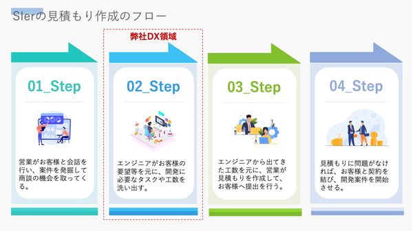 ITエンジニア向け見積もり作成のDXツールとして提供しており、見積もり工数をクラウドで一元管理することができるSaaSプロダクトです。チーム内で工数情報を共有することにより、より効率的に見積もり作成を行うことができ、エンジニアの負担を減らし、本来のバリューである開発業務に集中することができます。