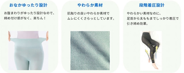 本商品は、やわらか素材で快適な着用感の着圧レギンスです。段階着圧設計で、足首は20hPaとしっかり引き締め、美脚効果を保ちつつ、お腹は縫い目のないシームレス仕様のゆったり設計で、脚をしっかり引き締めつつも、お腹は楽に過ごしたい方におすすめの商品です。レギンス、オープントゥハイソックス、オープントゥオーバーニーソックスの3アイテムをラインアップ。